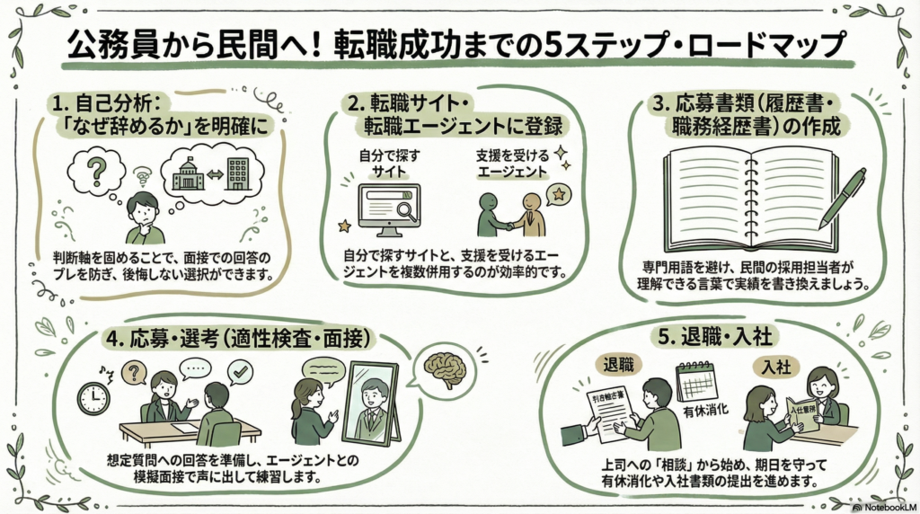 公務員から転職するための全体像を「5つのステップ」でわかりやすく解説します。